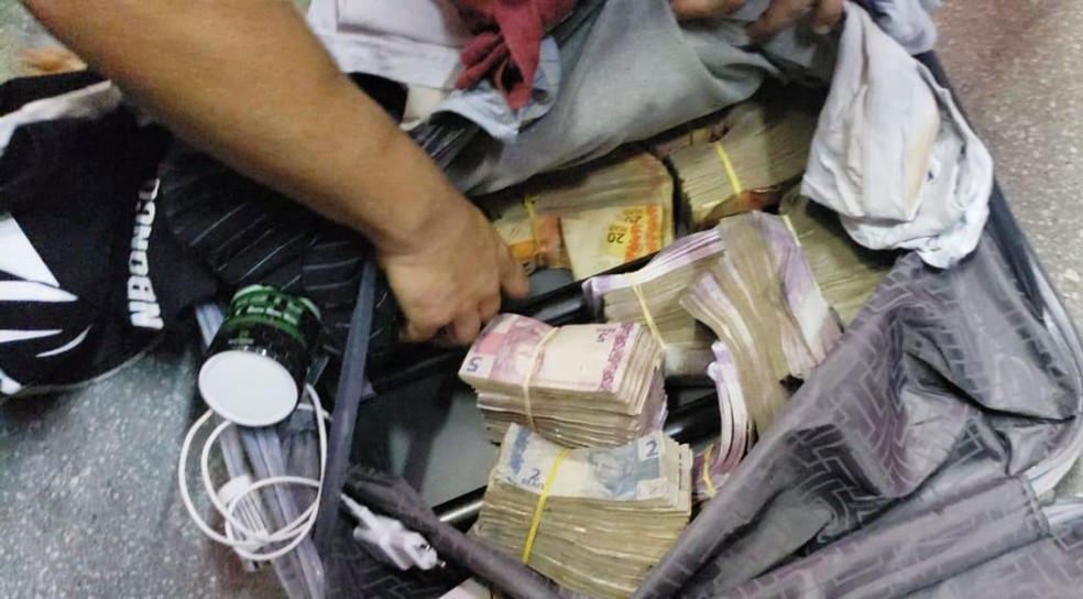 Mala com dinheiro encontrada com homens suspeitos de furtarem banco em Teixeira de Freitas, no sul da bahia — Foto: Divulgação/Polícia Federal