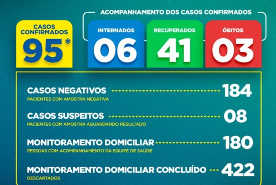 Há ainda outros 8 casos suspeitos, aguardando resultados, 184 que já foram descartados para Covid-19 e 180 pessoas estão sendo monitoradas pelas equipes de saúde.
