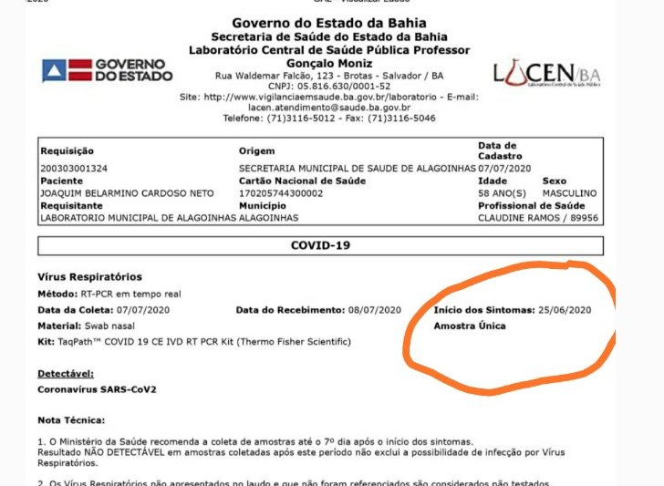 Apesar de informar que sentiu os sintomas na terça-feira (7) , mesmo dia em que se submeteu ao teste PCR, a ficha do resultado de Joaquim Neto aponta a informação de que o início dos sintomas se deu no dia 25 de junho, 12 dias antes de ter informado sobre o fato.