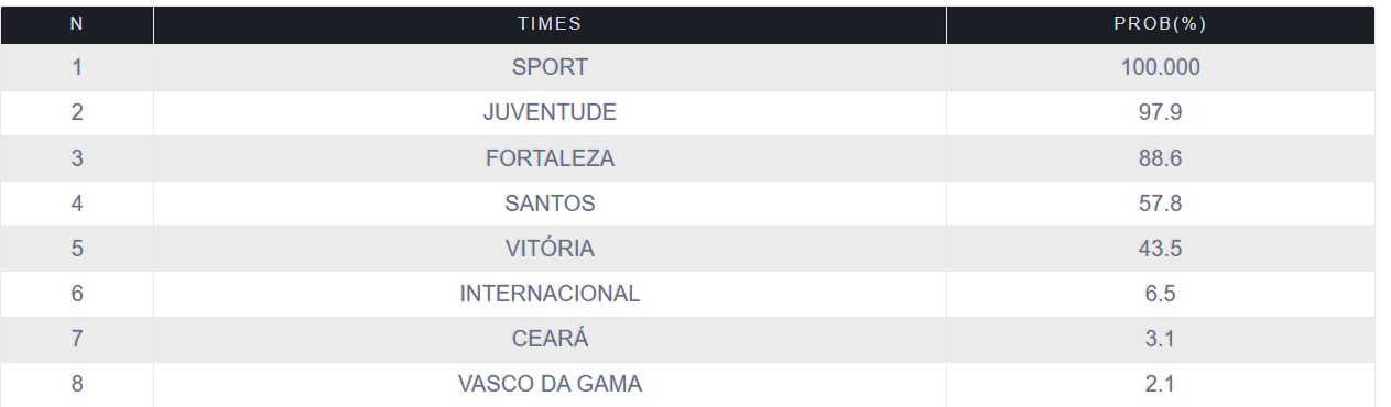 Fora do Z4, acima do Vitória, na 15ª colocação, está o Internacional, com 41 pontos e 6,5% de chances de queda. Depois aparecem Ceará e Vasco, com 42 pontos cada, e 3,1% e 2,1% de queda respectivamente.