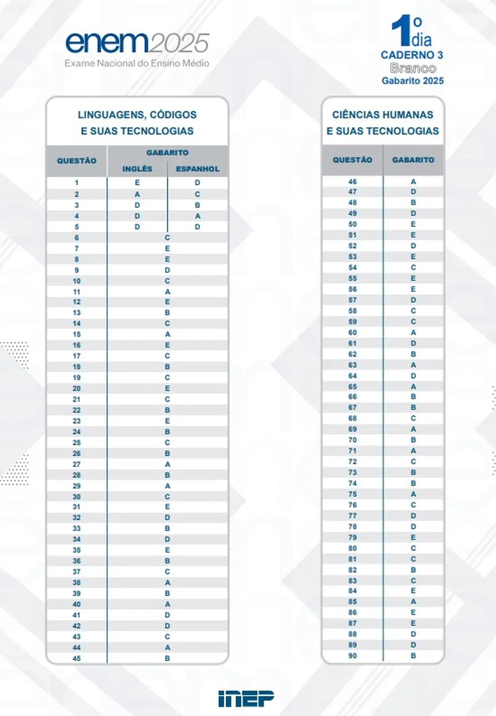 O Instituto Nacional de Estudos e Pesquisas Educacionais Anísio Teixeira (Inep) divulgou, nesta quinta-feira (13), o gabarito oficial da primeira prova do Exame Nacional do Ensino Médio (Enem) 2025, realizada no último domingo (9). As respostas das provas de Linguagens e Ciências Humanas foram publicadas na página oficial do Instituto (clique aqui).