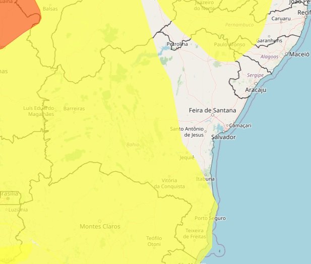 O aviso segue válido até as 10h desta terça-feira (2) e inclui sobretudo cidades do Sul, Extremo Sul, Norte, Oeste e Sudoeste da Bahia, muitas delas afetadas por volumes elevados de chuva nesta época do ano. Segundo o Inmet, a previsão indica possibilidade de chuvas entre 20 e 30 mm/h, podendo chegar a 50 mm/dia.