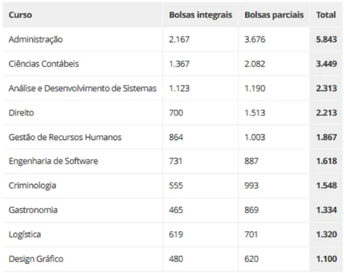 O curso de administração lidera a oferta de vagas na Bahia, com 5.843 bolsas, sendo 2.167 integrais e 3.676 parciais. Em seguida aparecem os cursos de ciências contábeis, com 3.449 bolsas (1.367 integrais e 2.082 parciais), e análise e desenvolvimento de sistemas, que soma 2.313 oportunidades, entre 1.123 integrais e 1.190 parciais.